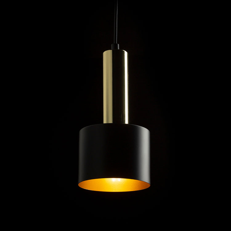 Minimalistic cylindrical pendant for GU10 light sources on a round base. Springs attached to the socket enable the use of light sources of various lengths.