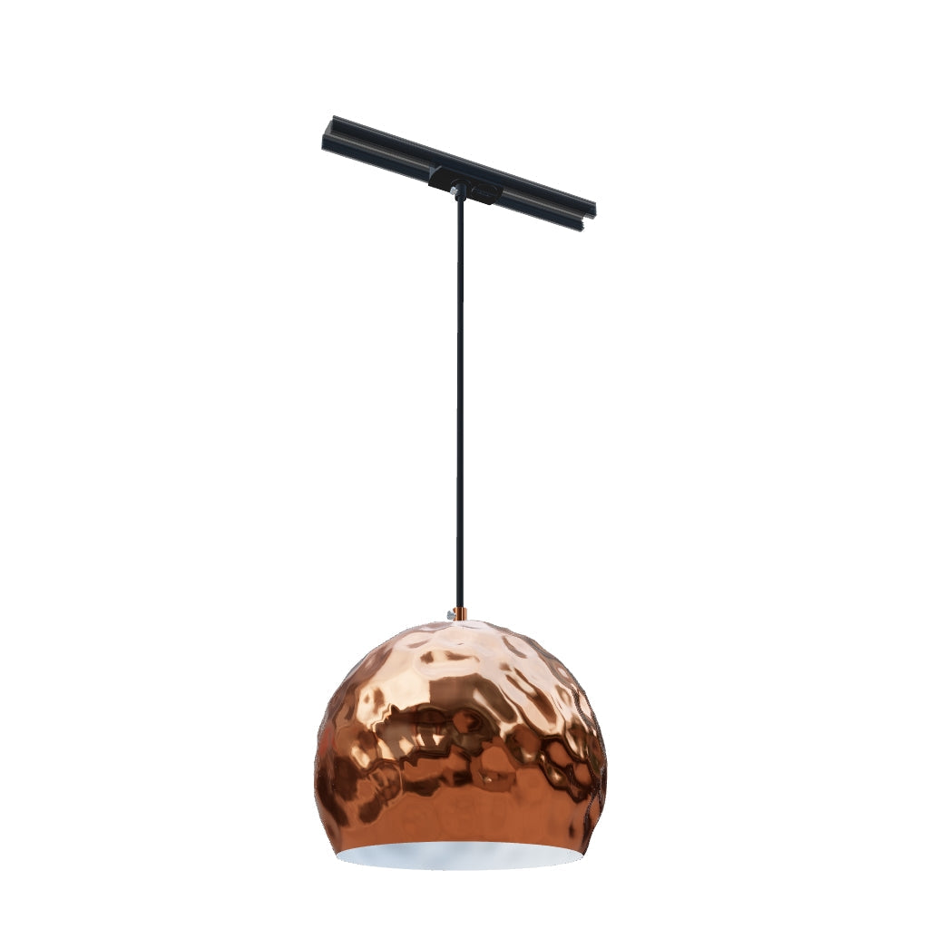 Pendant with a dented metal shade. The outside of the shade is copper-colored and the inside is white-lacquered. Supplied with a black PVC-cable with adapter for 1-circuit tracks.