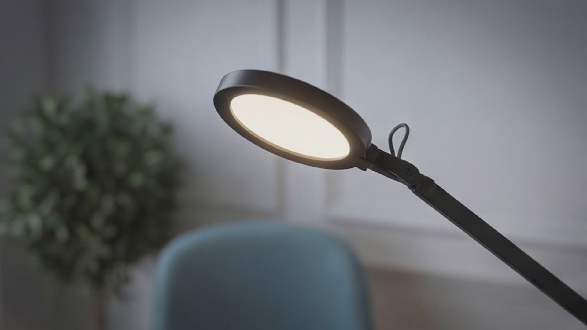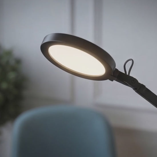 Work desk lamp with built-in LED, a jointed arm, and a dimmer switch located on the top of the reflector for three-step dimming. The lamp can be attached to a desk or shelf by purchasing a separate EMA C-clamp (R14290, R14291).