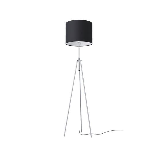 Floor lamp on tripod with adjustable height, textile shade and E27 socket.