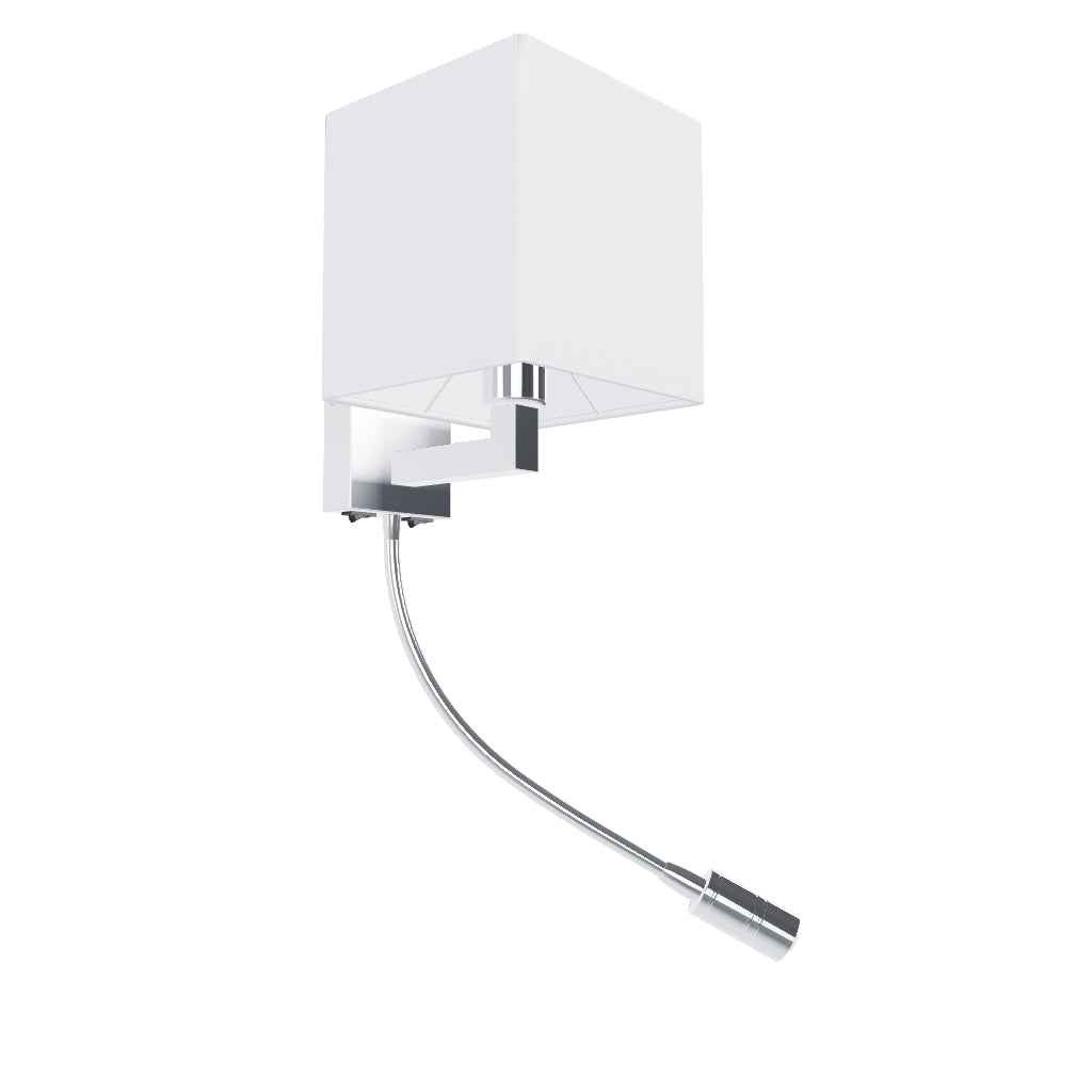 Wall lamp with a textile shade and a LED spotlight on gooseneck. Both light sources can be controlled individually by switches located on the angular base of the lamp.