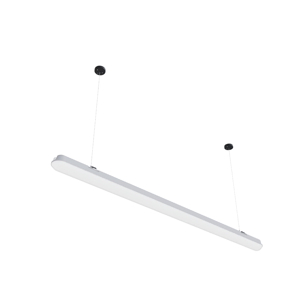 Linear factory-grade LED-light for ceiling installation or suspension if used with suspension kit G13672. High light output and with IP65 protection. Supplied without the suspension kit and power cable. Multiple lights can be linked in a series.